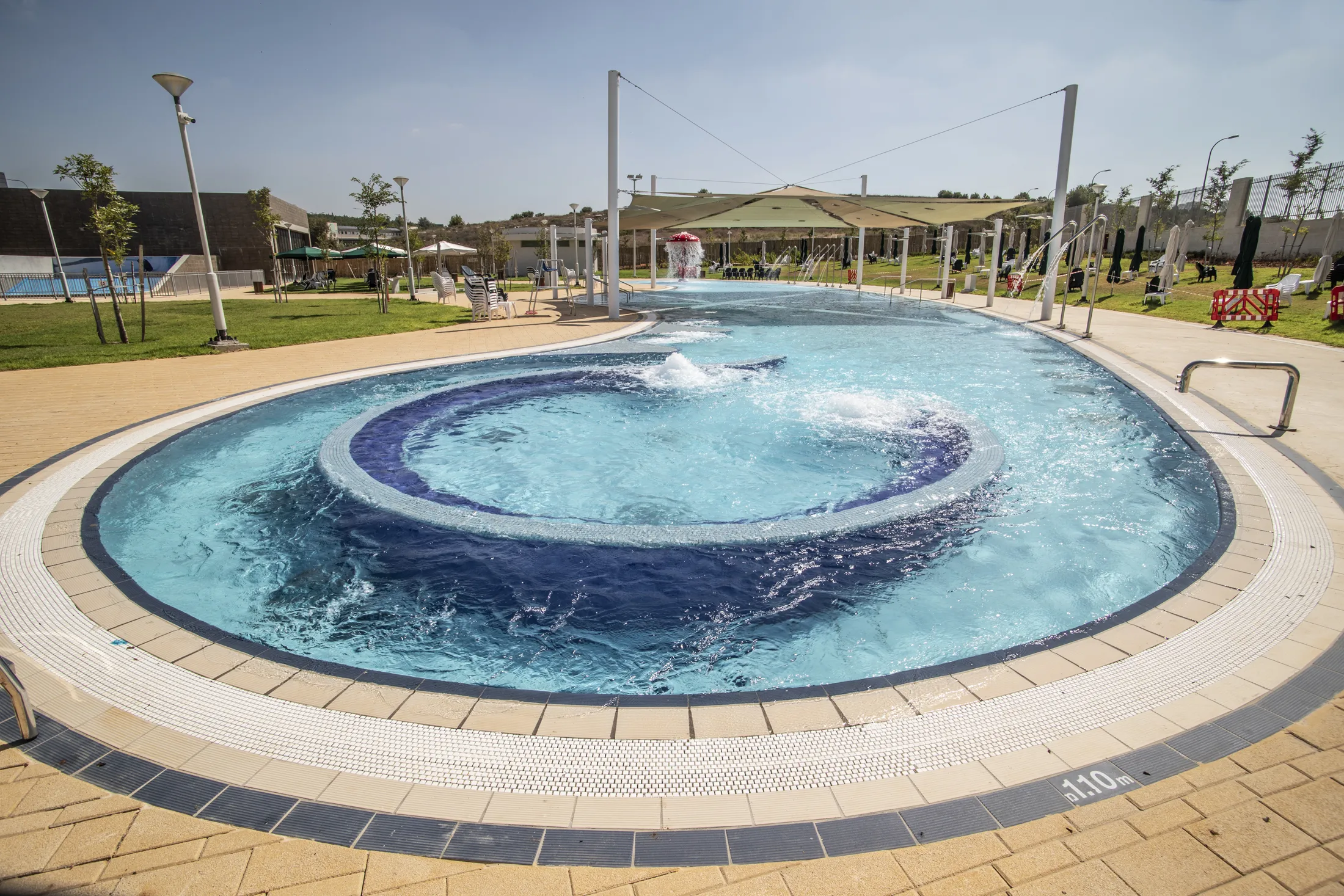בשטחי הפיתוח מדשאות, רחבות שבילים וטריבונות שיזוף הצופות לבריכת הפנאי.